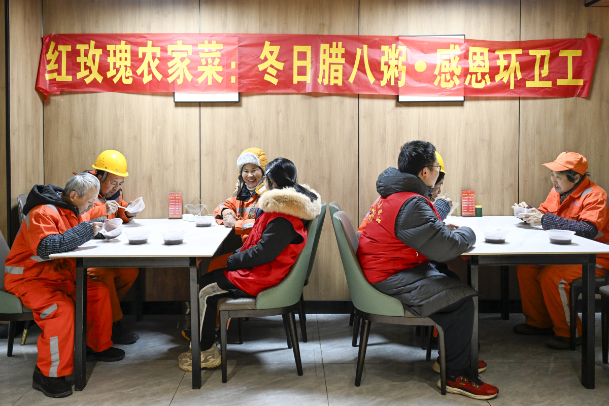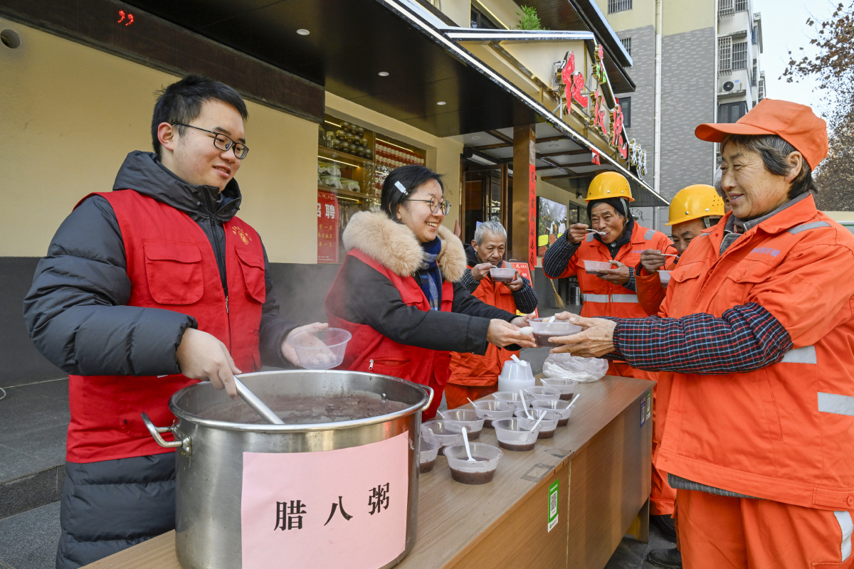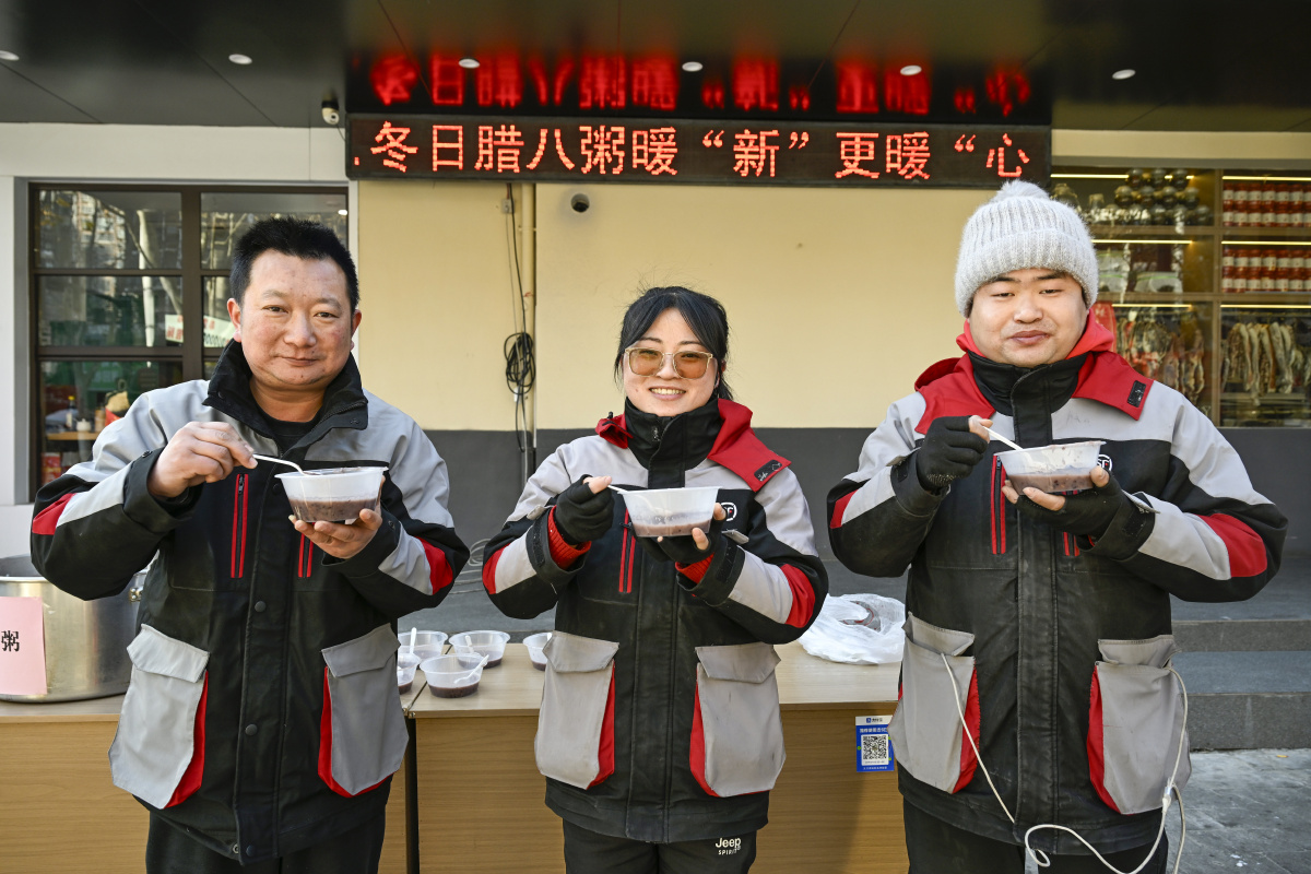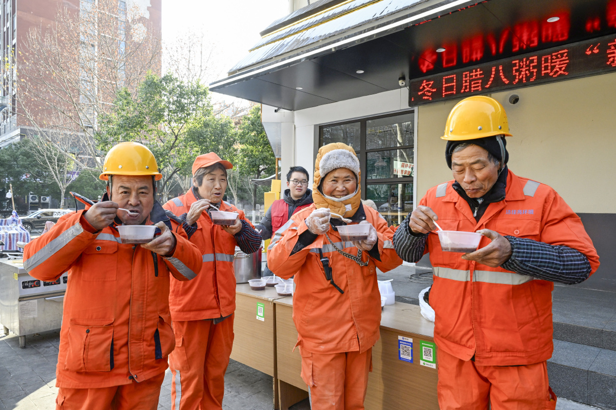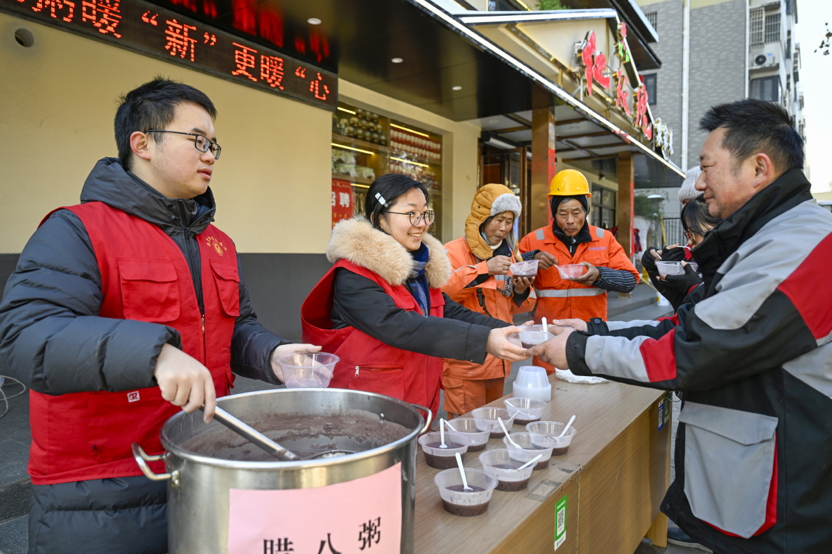 2026年1月22日,在安徽省合肥市庐阳区海棠街道荷塘社区,快递小哥正在品尝暖心腊八粥。当日,海棠街道总工会开展“寻味腊八,暖‘新’福到”主题活动,志愿者为寒冬中坚守一线的快递员、外卖骑手、环卫工人等新就业群体送上腊八节日的祝福与关怀,让浓浓的温情在城市中流淌。