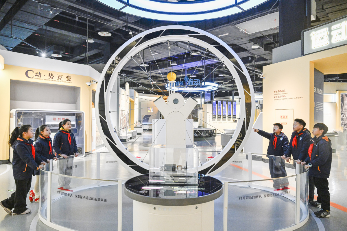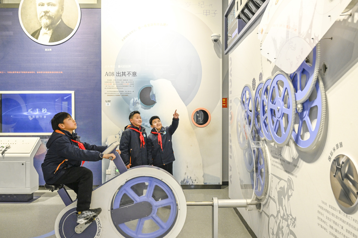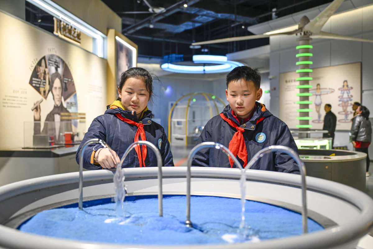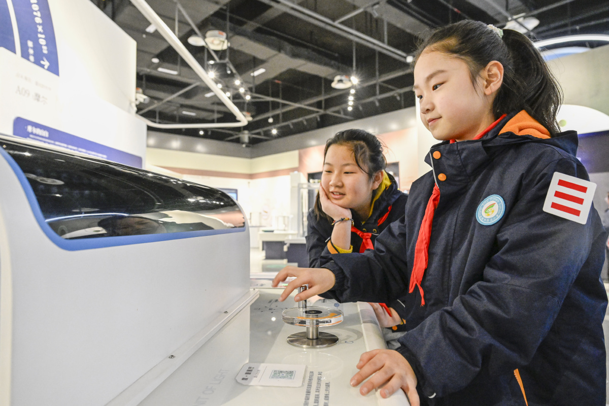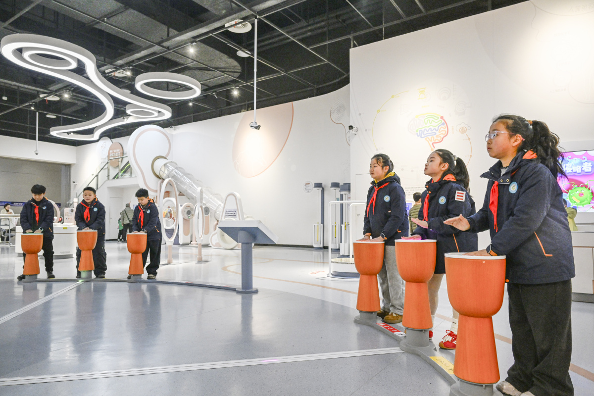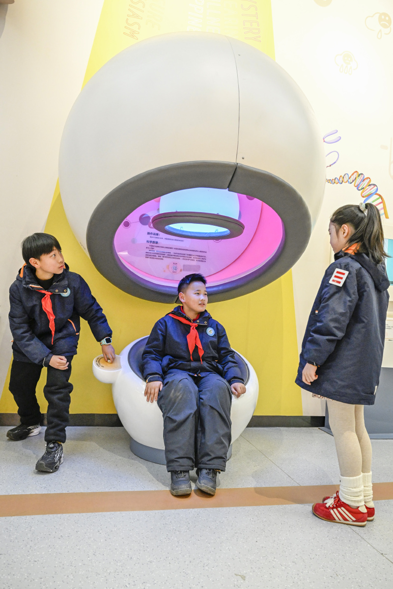 2026年2月4日,在安徽省合肥市科技馆,来自庐阳区四河小学的小学生正在体验科普设备,学习科技知识。当日,该校组织学生开展“学科学、爱科学、用科学”寒假课外主题活动,学生们通过参观体验各种科普展览和趣味科普游戏,学习科普知识,感受科技魅力。