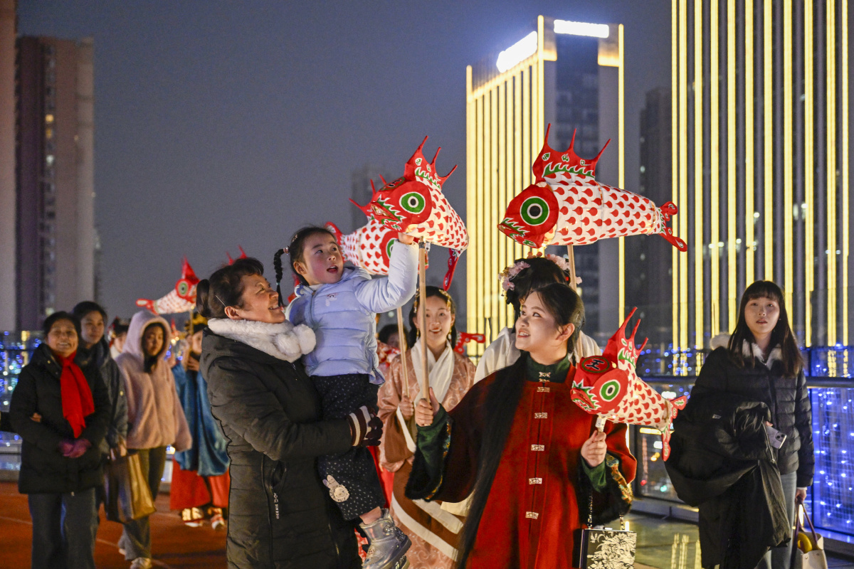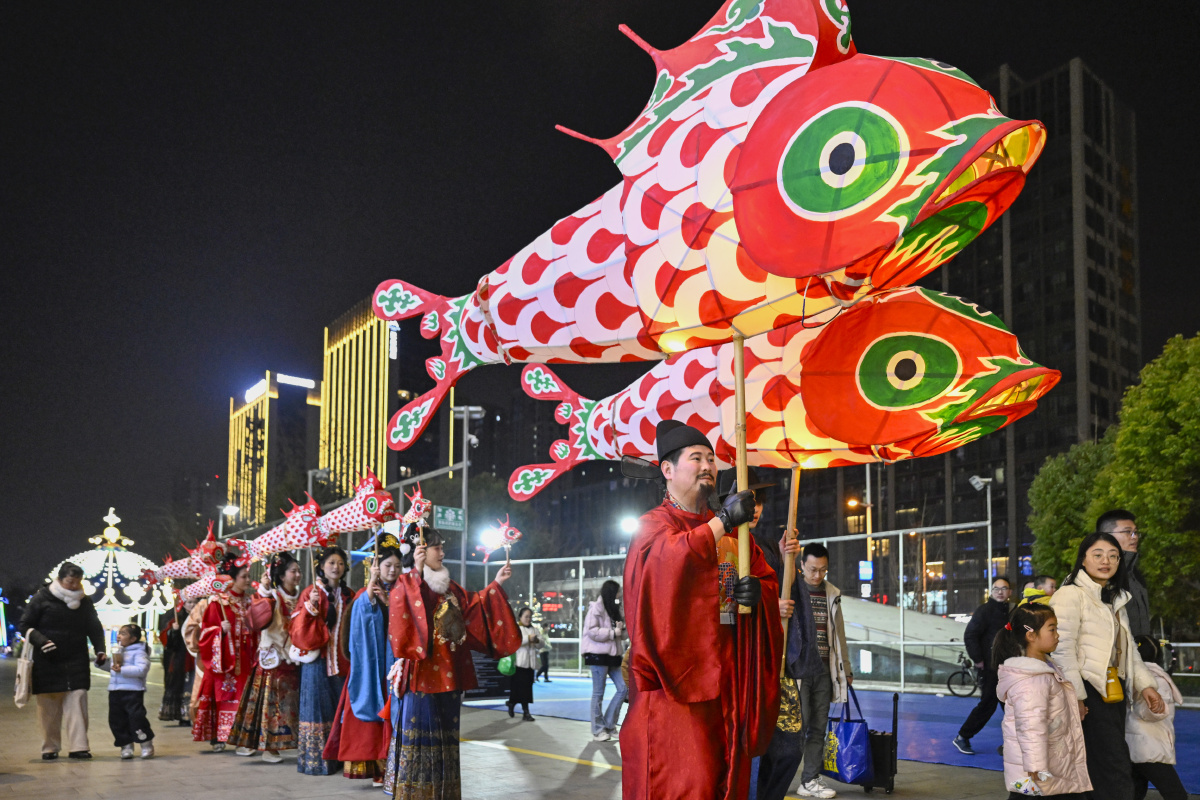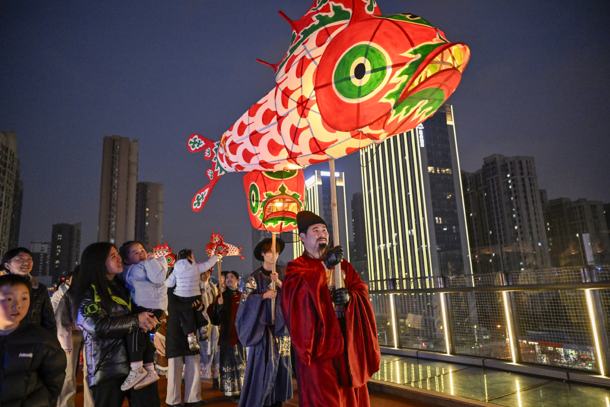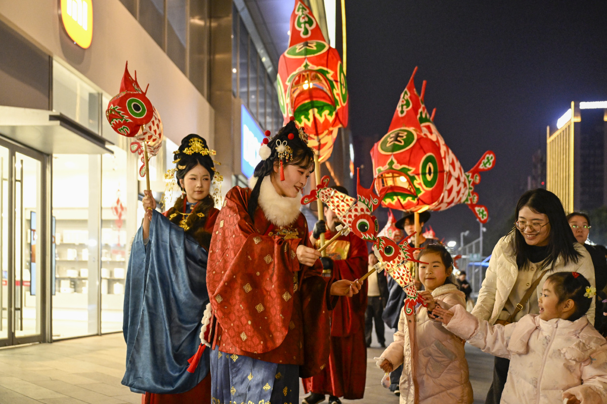 2026年2月7日,在安徽省合肥市庐阳区海棠街道辖区庐阳万象汇,鱼灯表演队伍正在巡游展演,场面热闹非凡。春节临近,海棠街道联合辖区商业综合体开展“非遗闹新春”主题活动,鱼灯巡游、非遗糖画、非遗剪纸、白族扎染等民俗类活动,吸引众多市民驻足围观。
