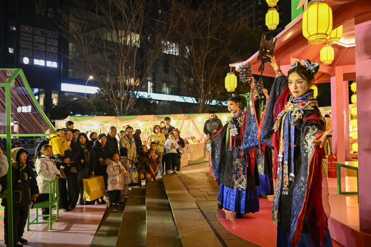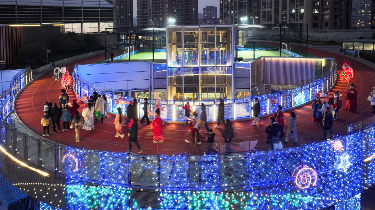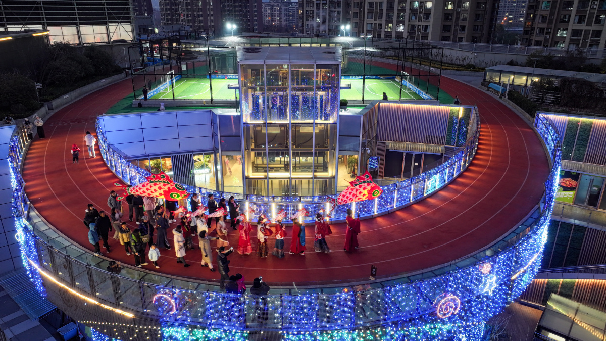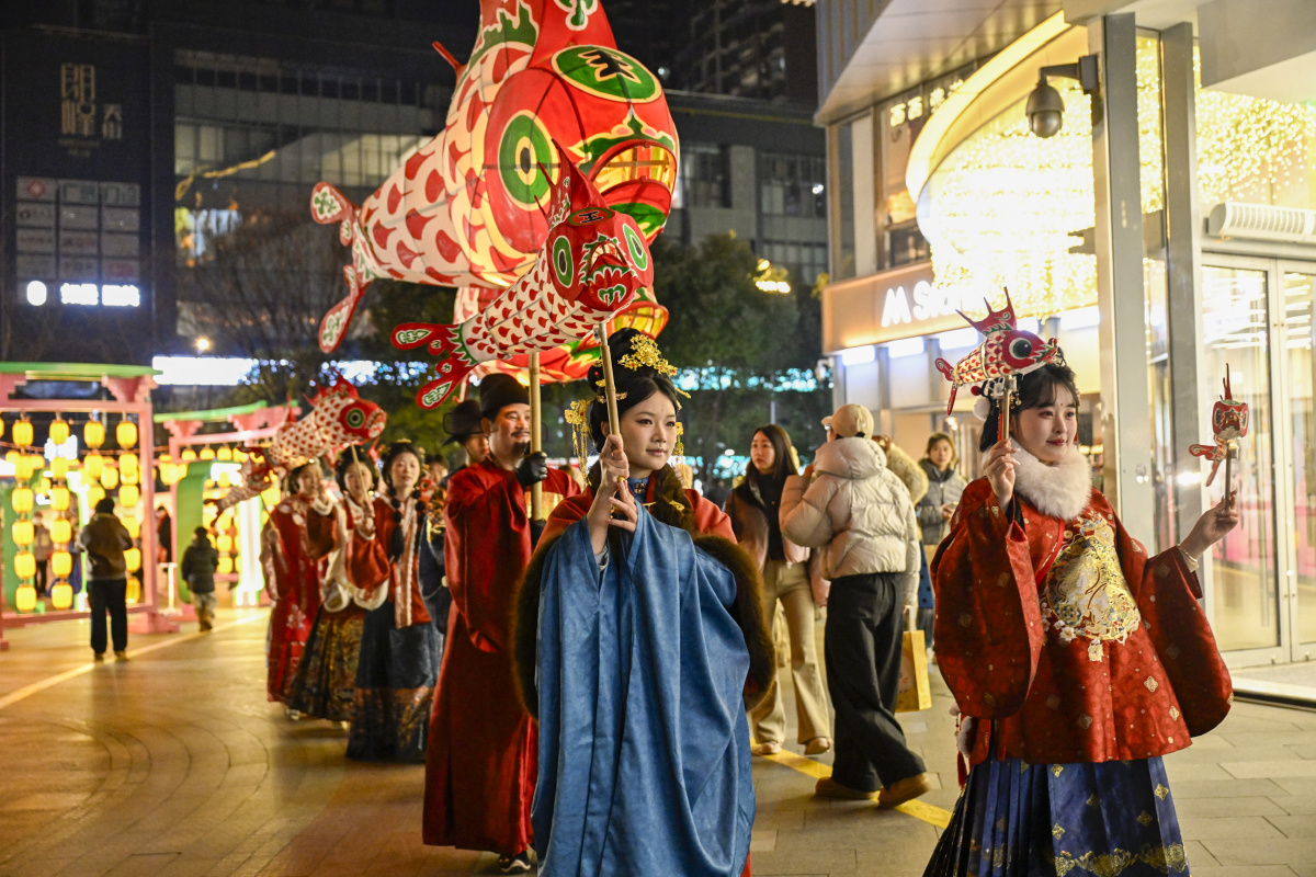 2026年2月7日,在安徽省合肥市庐阳区海棠街道辖区庐阳万象汇,鱼灯表演队伍正在巡游展演,场面热闹非凡。春节临近,海棠街道联合辖区商业综合体开展“非遗闹新春”主题活动,鱼灯巡游、非遗糖画、非遗剪纸、白族扎染等民俗类活动,吸引众多市民驻足围观。