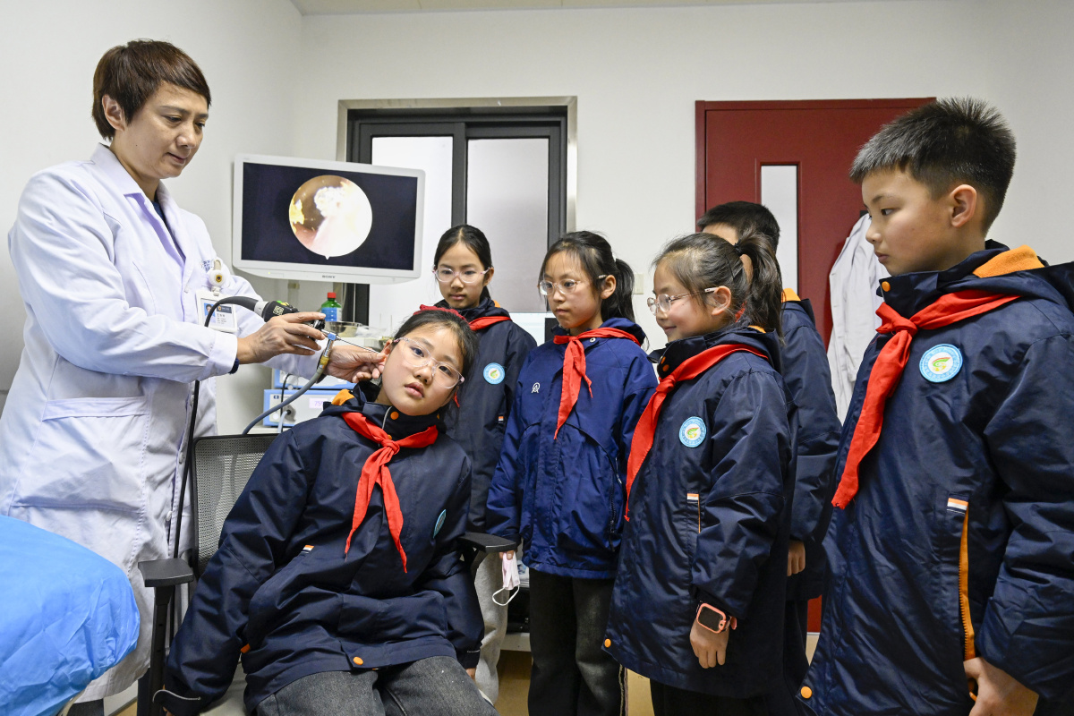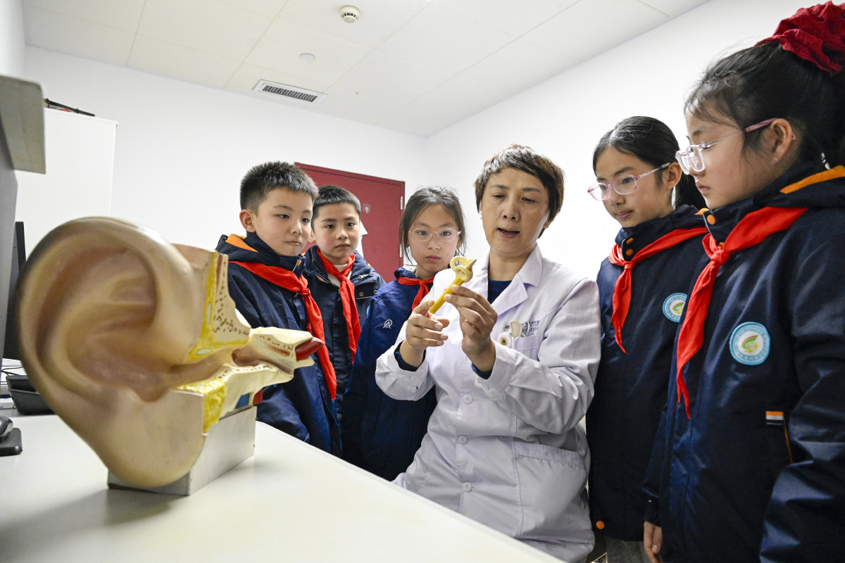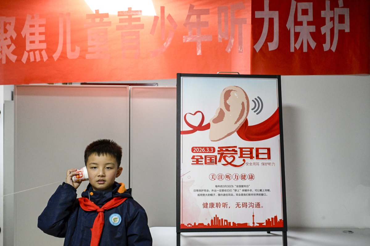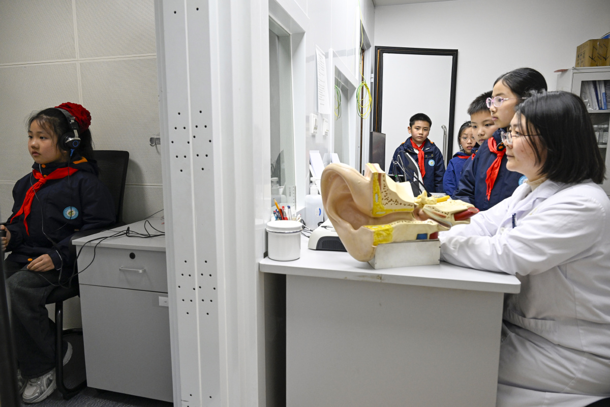2026年2月26日,在安徽省合肥市第一人民医院耳鼻喉科门诊室,来自合肥市庐阳区四河小学的小学生正在检测听力,学习爱耳护耳知识。当日,四河小学联合辖区医院开展“爱耳护耳 从小做起 ”活动,医生为小朋友们检测听力,讲解耳朵构造,普及爱耳护耳知识,引导孩子们从小养成良好的用耳习惯,增强爱耳护耳意识。