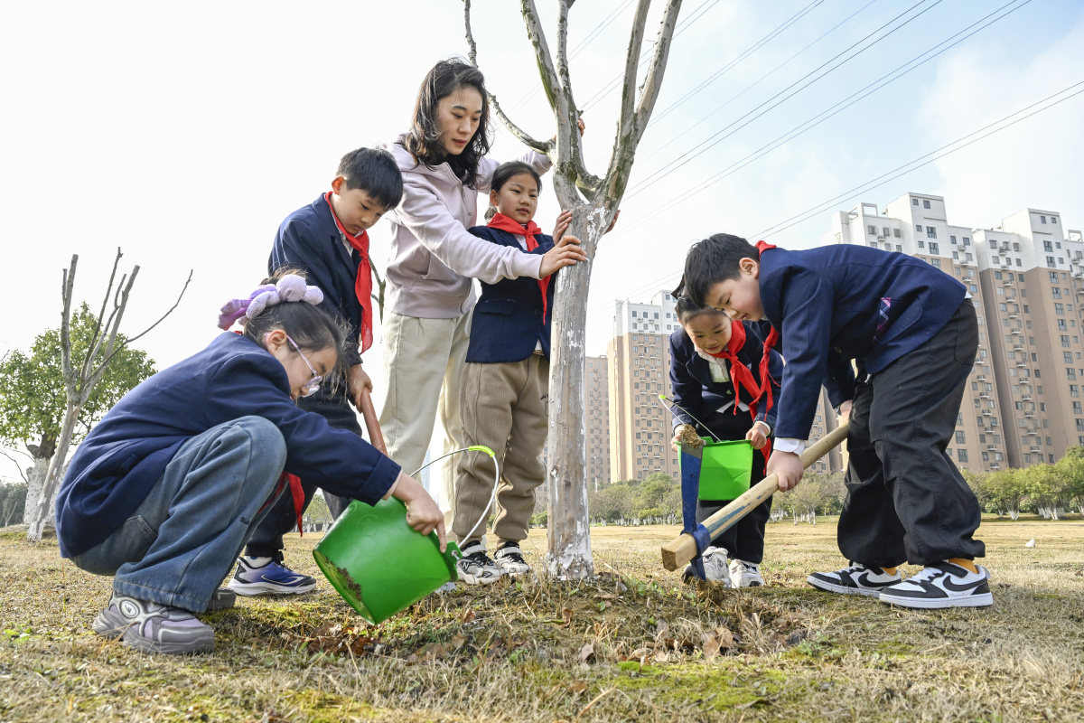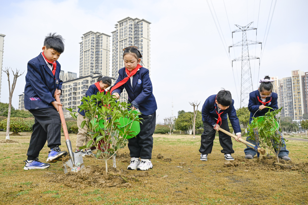 2026年3月4日,在安徽省合肥庐阳经济开发区太和路高压线绿化带,来自合肥市六安路小学荣城花园分校的小学生正在进行义务植树。在植树节到来之际,该校组织开展义务植树活动,学生们挖穴、种植、施肥、培土、浇水,体验劳动乐趣,为开发区增添新绿,美化环境。