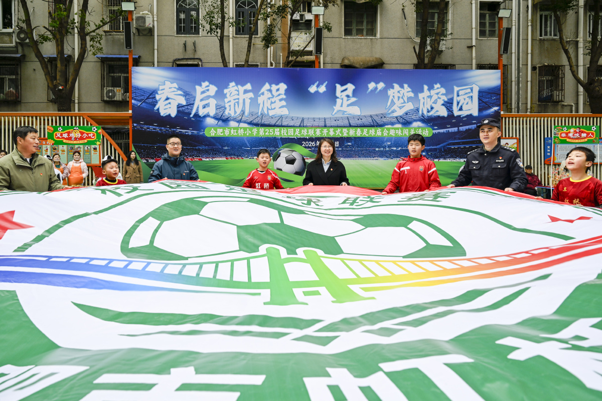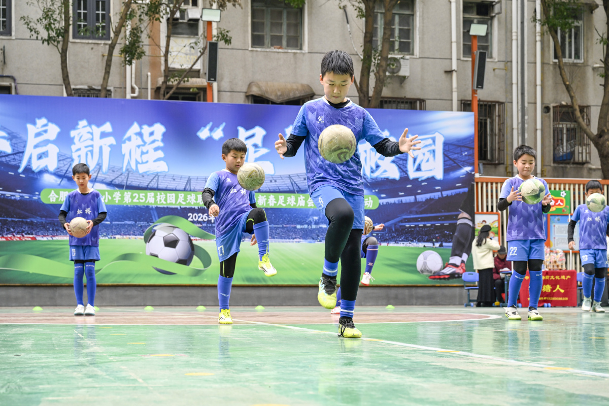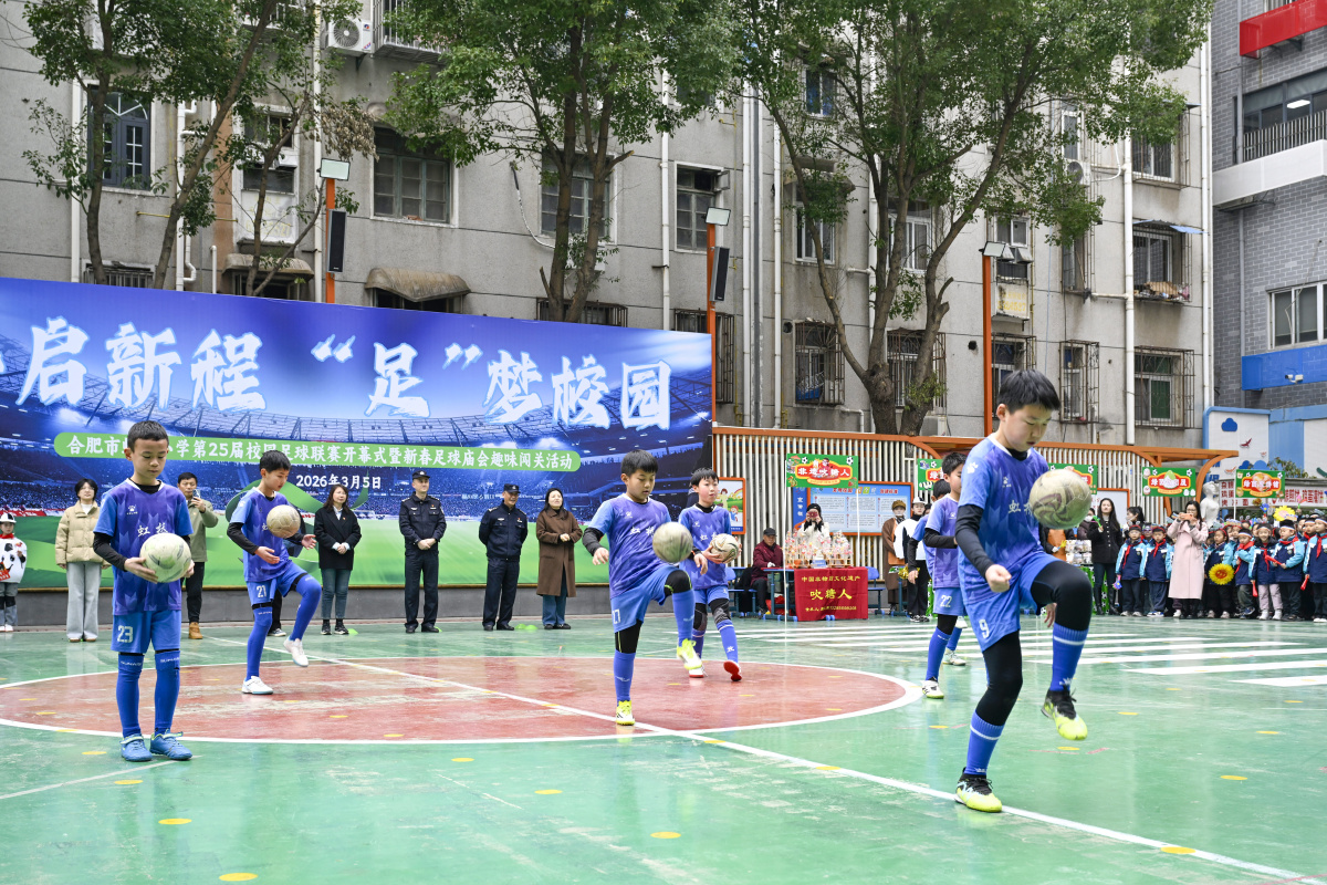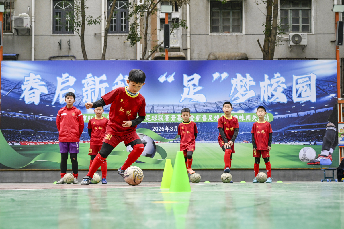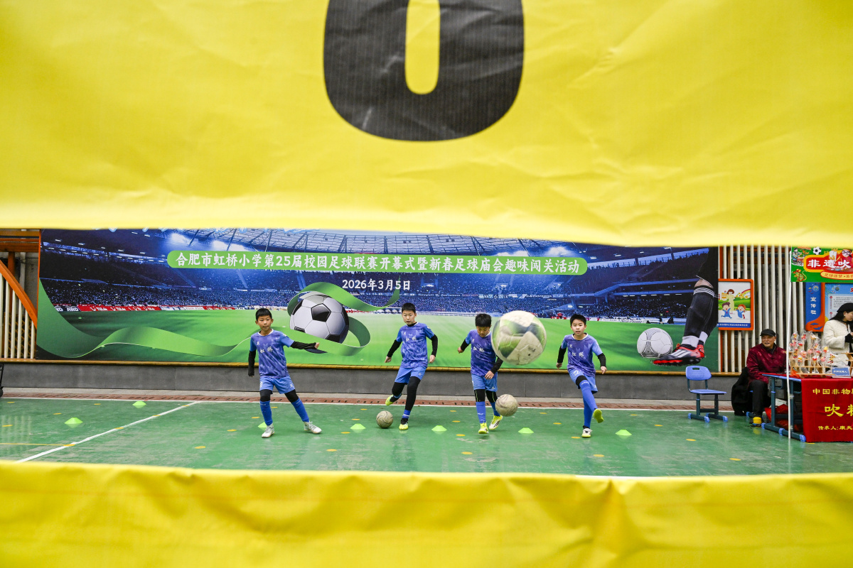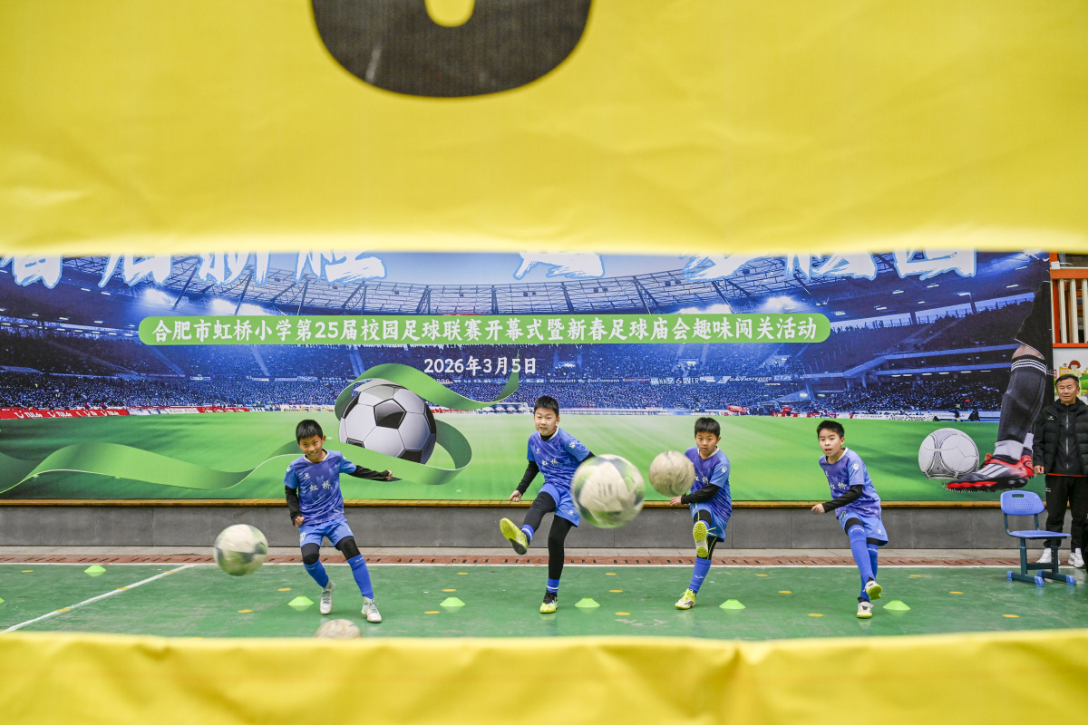 2026年3月5日,在安徽省合肥市庐阳区虹桥小学,小学生正在参加趣味足球运动游戏。当日,合肥市各中小学迎来春季开学季,该校通过开展快乐颠球、桌面足球赛、足尖绕桩、一球击倒、球趣涂鸦等丰富多彩的趣味足球运动游戏,激发学生们对体育运动的热情,树立“健康第一”的理念,感受运动的快乐,书写新学期的崭新篇章。