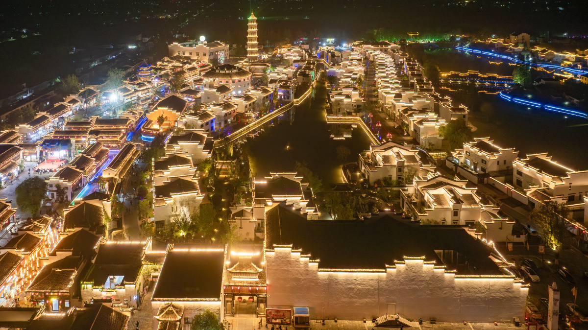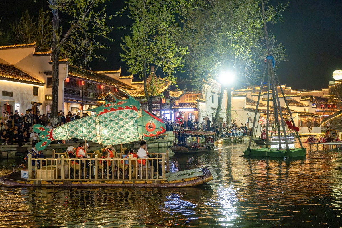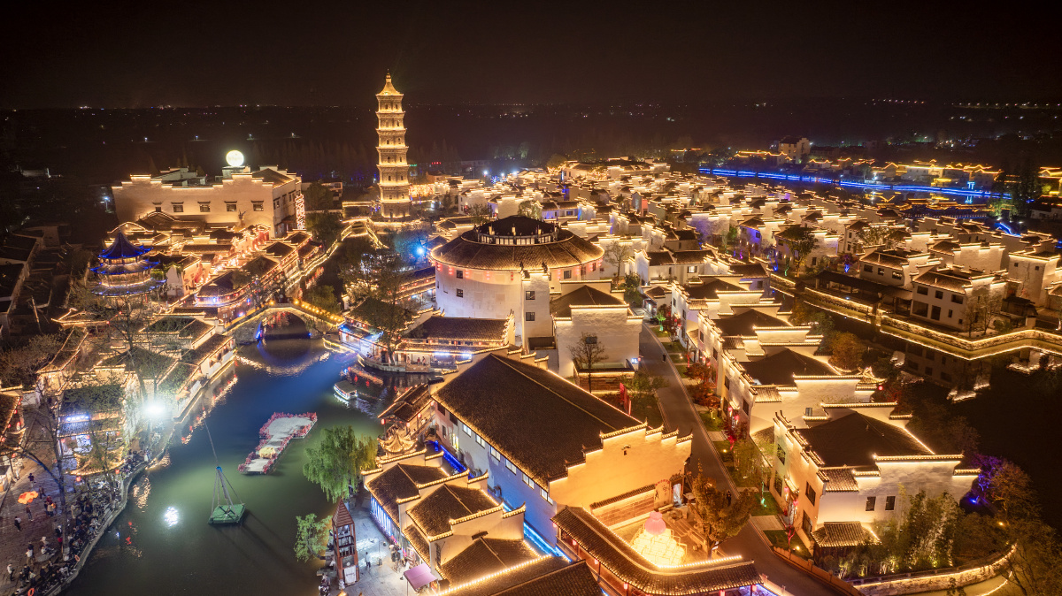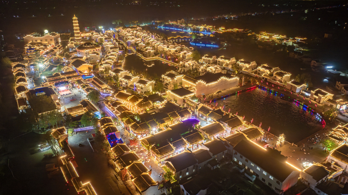 2026年4月10日晚,安徽省铜陵市义安区犁桥水镇游人如织,夜晚的灯光分外璀璨,让游玩的旅客彷佛走入画中,美不胜收。
